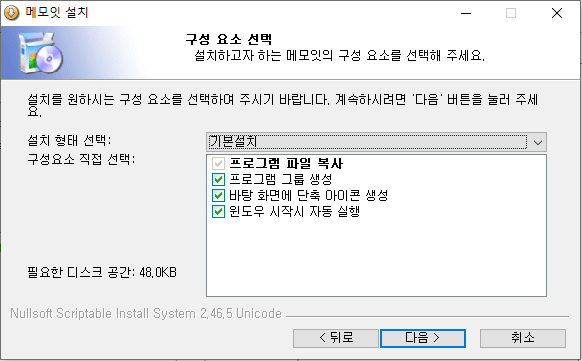 동의함을 누르고 나면 구성 요소를 선택할 수 있는데요 윈도우 시작시 자동실행을 해놓으면 별 신경쓰지 않아도 언제든지 쓸 수 있는 메모잇이 나오기 때문에 참 좋죠