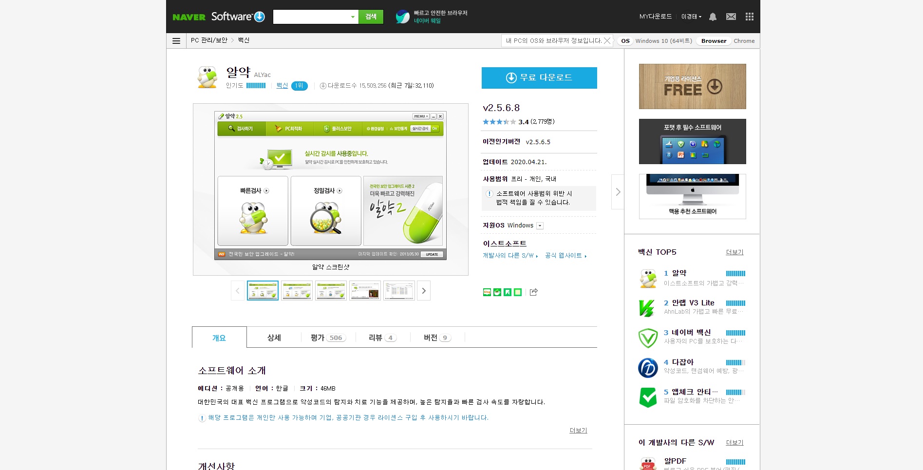 알약 다운로드를 클릭하면 이렇게 네이버 소프트웨어가 뜬답니다 역시나 알약 무료 다운로드가 저희를 기다리고 있답니다 소프트웨어에 대한 소개를 하자면 대한민국의 대표 백신 프로그램으로 악성코드의 탐지와 치료 기능을 제공하며 높은 탐지율과 빠른 검사 속도를 자랑하는 소프트웨어랍니다 옆을 보니 알PDF나 알드라이브 같은 다른 것들도 많이 있네요 알약도 여러가지 시도를 했나봐요 그렇죠 사실 가만히 앉아만 있으면 도태될 수 밖에 없으니까요 갑자기 문득 든 생각이 카카오에서도 이런 백신을 개발하려 하진 않을까 생각이 들더라구요 뭔가 카카오는 뭐든 다 하려고 할 것 같아서요