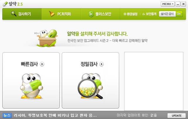 알약을 설치하고 나면 이렇게 검사하기가 나온답니다 빠른검사와 정밀검사가 있는데 제가 추천드리는건 빠른검사는 이왕이면 하루에 한번 정도를 하시면 되고 정밀검사는 2주에 한번은 하시는게 좋답니다 게다가 PC최적화라는 부분이 있더라구요 알약이 최적화까지 진행해줄줄은 몰랐는데 기능들이 상당히 좋아지는구나 라는걸 느끼는 하루였답니다 그럼 오늘의 소개는 모두 마치도록 할게요 다들 즐거운 하루 보내세요