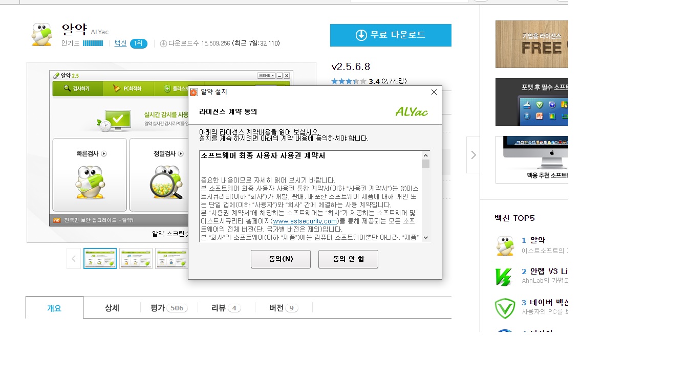 알약 무료 다운로드를 클릭하시고 다운 받으시면 이렇게 알약을 설치하겠냐는 안내문이 나온답니다 다들 동의하실거잖아요? 무료니깐 더 볼 것도 없이 동의해버렸답니다 물론 이 다음에 동의여부를 묻는게 하나 더 나왔지만 굳이 사진을 첨부하지는 않았어요 어차피 다 동의하실걸 알기때문에... 제 말이 맞겠죠?